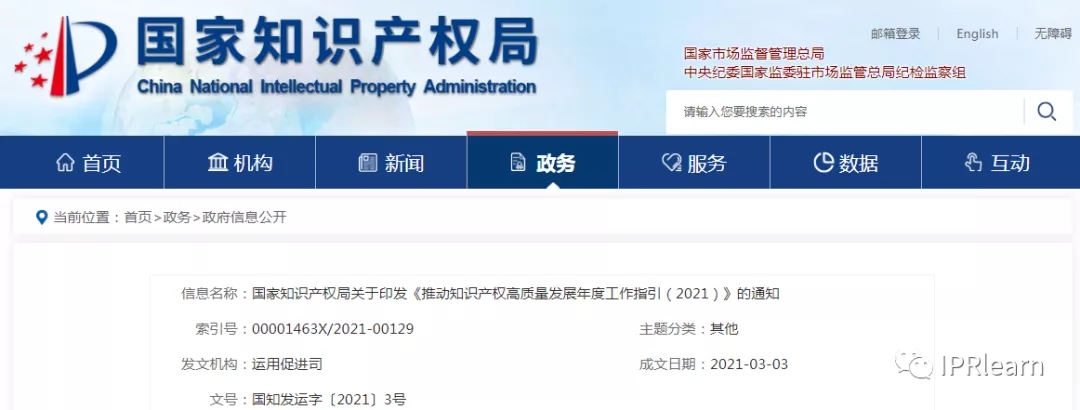 國家知識產(chǎn)權局關(guān)于印發(fā)《推動(dòng)知識產(chǎn)權高質(zhì)量發(fā)展年度工作指引(2021)》的通知