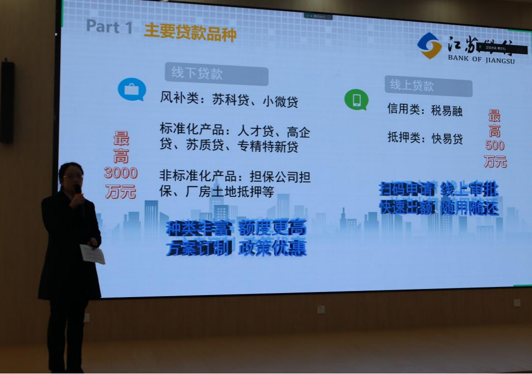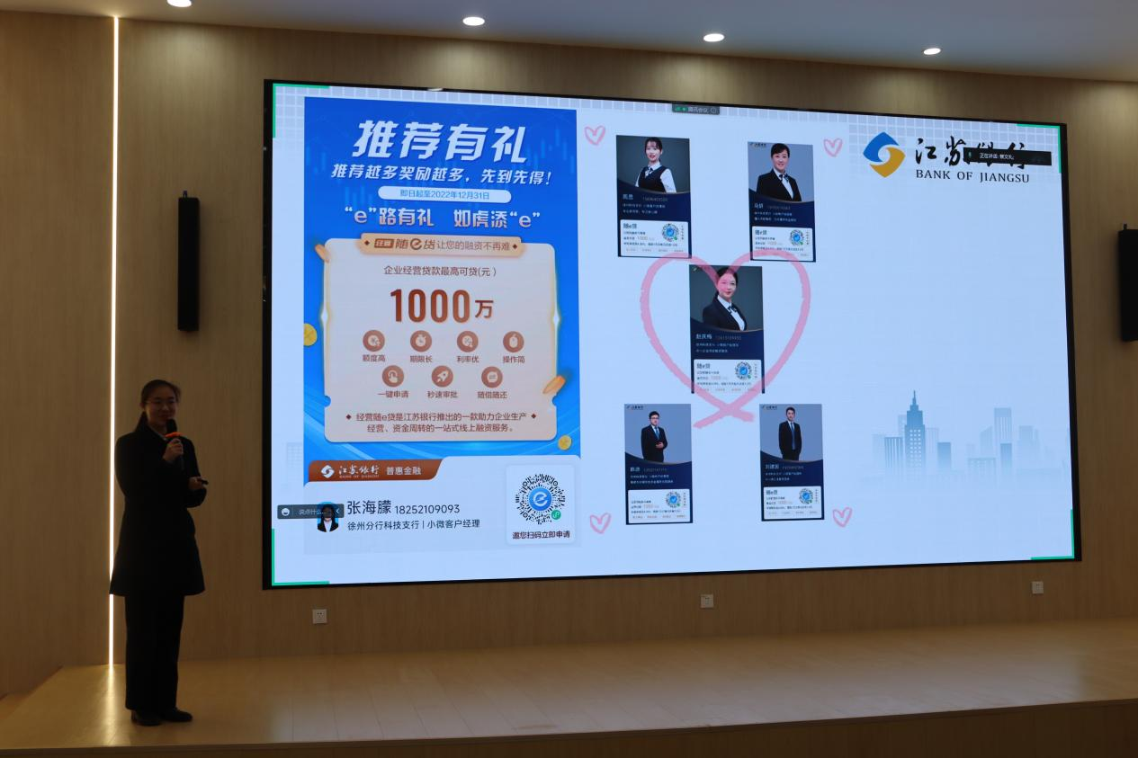 江蘇銀行徐州科技支行小微客戶(hù)經(jīng)理張海朦、理財經(jīng)理汪佳蕙圍繞科技小微創(chuàng )業(yè)企業(yè)融資難的“痛點(diǎn)”開(kāi)展特色金融服務(wù)推介,并圍繞科技小微創(chuàng )業(yè)企業(yè)固定資產(chǎn)少、科技含量高等特點(diǎn),重點(diǎn)推介了蘇科貸、小微貸、人才貸、高企貸、蘇質(zhì)貸、專(zhuān)精特新貸等特色金融產(chǎn)品。